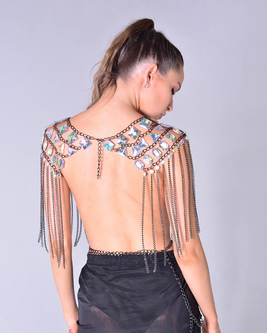 This rhinestone chain top is your lucky found. Be creative and pair it with pasties and different tops. It’s a great addition to add to your festival wardrobe. I love the rhinestone and black chain tassel details, with this special piece, your magical journey is yet to begin!