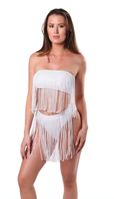 Own the night in this bright tube top set with dangling rhinestone tassels that swing with movement and sparkle under the light.