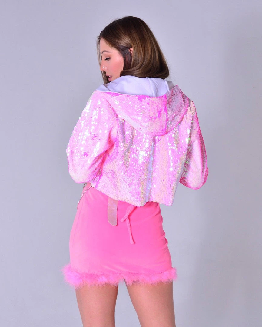 This cropped jacket is made of high quality sequins. It comes with super soft inner layer so you can be comfortable while stylist. Super sparkle both during the day and night. Pair with any styles.