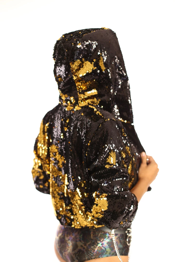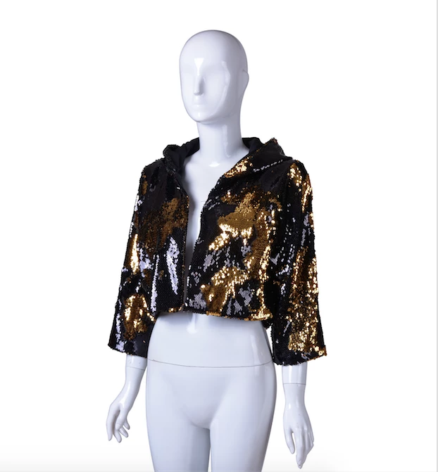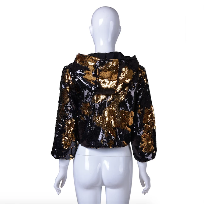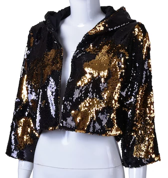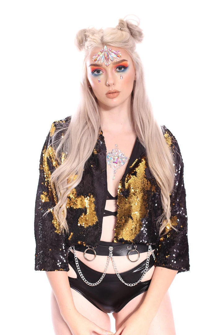 This reversible cropped sequin jacket is made of gold/black sequins. It is SO cute! Wear if for everyday as well as at festivals. Be ready to get tons of compliments! 😀 It is one size fits XS – XL. The jacket has a soft inner layer that makes the whole experience so different, it is SUPER comfortable!