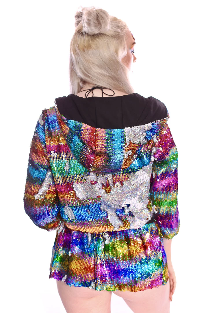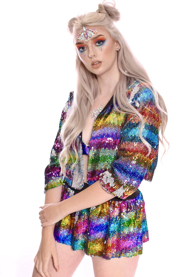 This reversible cropped sequin jacket is made of dreamy rainbow sequins. It is SO cute! Wear if for everyday as well as at festivals. Be ready to get tons of compliments! 😀 It is one size fits XS – XL. The jacket has a soft inner layer that makes the whole experience so different, it is SUPER comfortable!