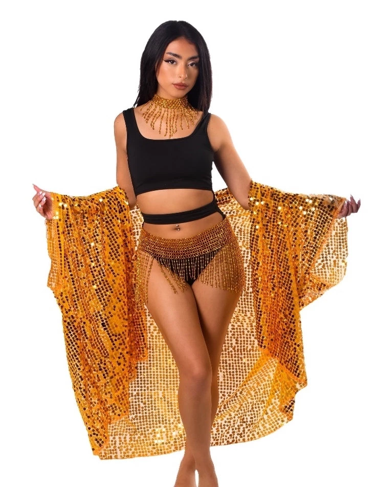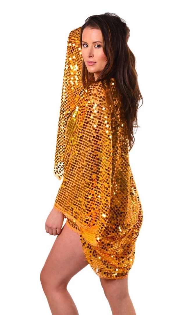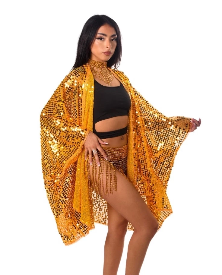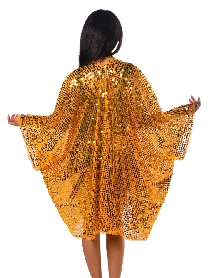 Dance the night away in this amber gold colored sequin kimono with tassels that swing with movement and sequins that shimmer under the light