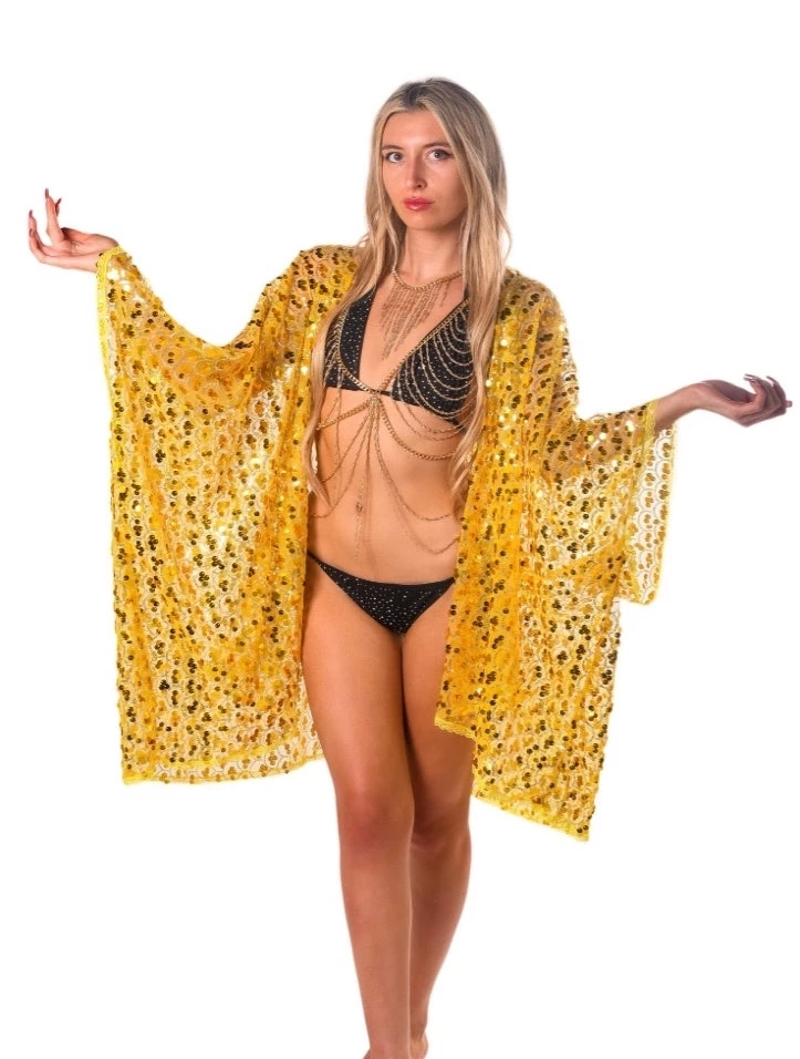Dance the night away in this gold sequin kimono. Each individual sequins reflects the light to shine in every direction. We want you to be the center of attention- that why we ensure the sequins and fabric are of the highest premium material.