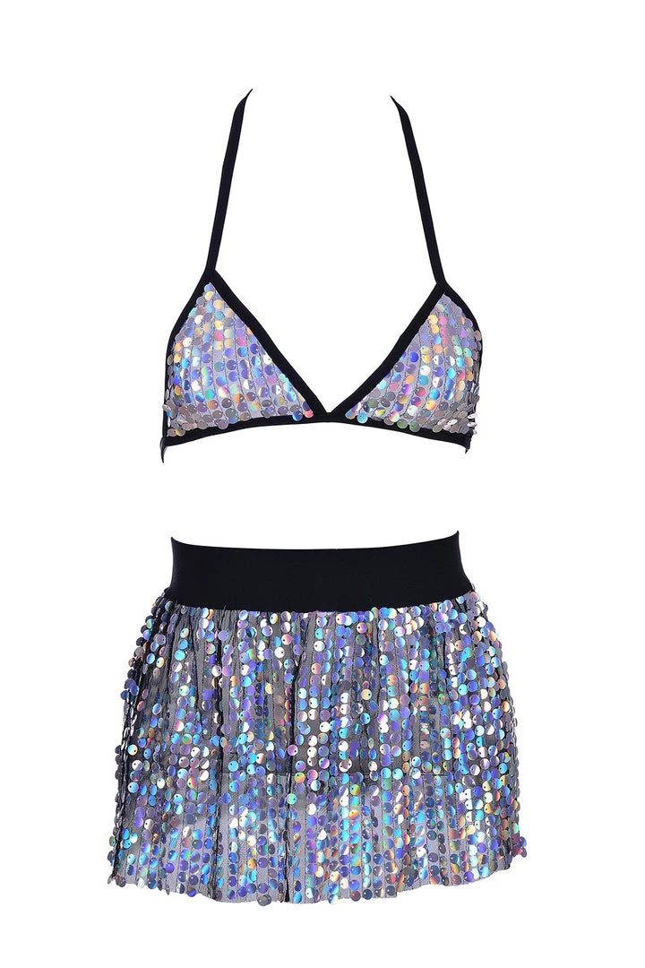 Our sequin set contains bra top and skirt. The bra top is tie at neck and back. The strings are handmade that’s super soft and comfortable to wear. The skirt has elastic band around the waist which makes if flexible to fit. This set is super cute, you can also style the two pieces separately for multiple uses.