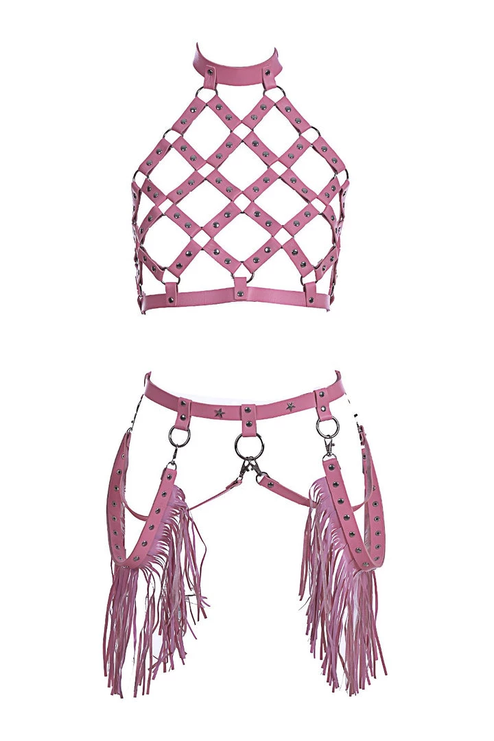 The body harness is made of vegan leather & chains. We make sure that no animals are hurt during the production. Harness is ONE SIZE fits all, comfortably adjust at neck & back. Style with bra/halter tops, or even just the pasties. Go get LIT. Perfect for party wear, costumes, festival clothing, festival fashion, rave wear, & EDM outfits, etc.