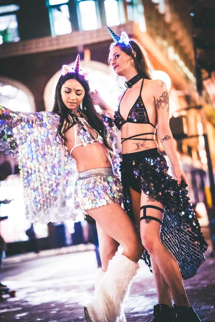 The sequins reflects different colors. Exclusively designed and handmade in the USA. We use only the highest quality fabrics and sequins, spreading positive vibes through your movement. In the sunlight, the sequins can be seen for miles, during the night, it diffracts light from every direction, no matter how far away.