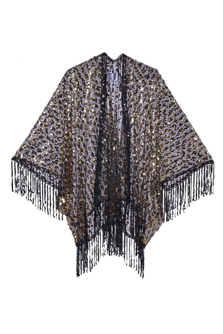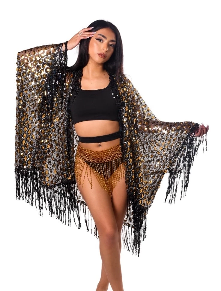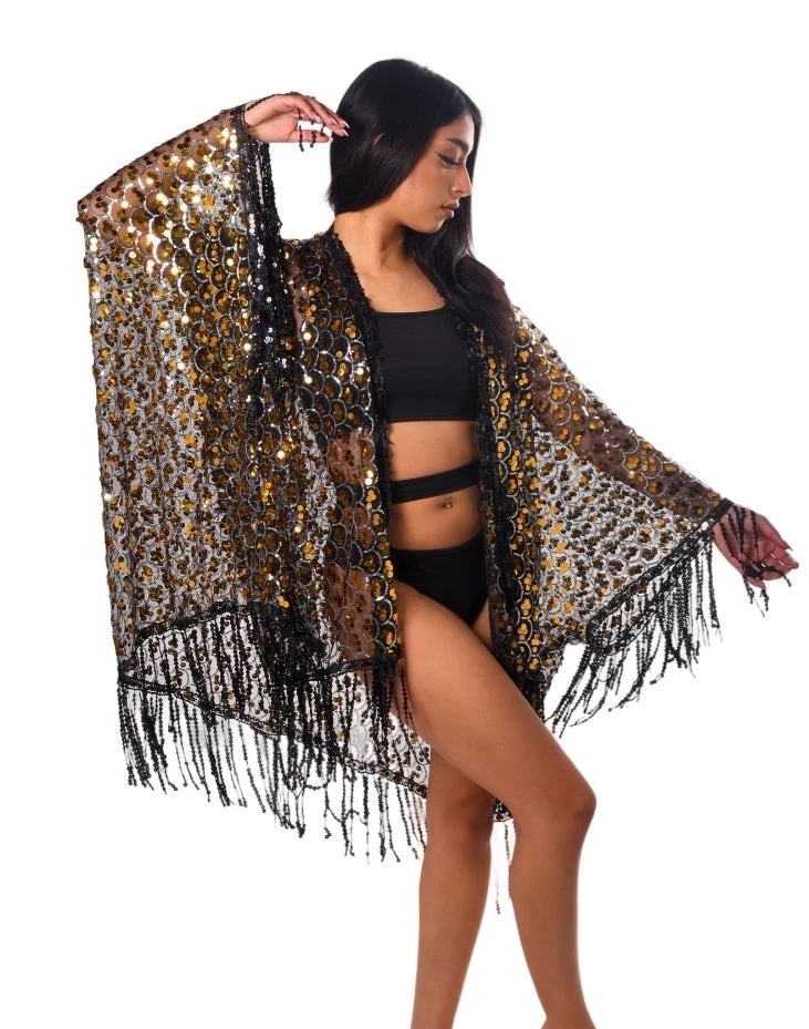 Dance the night away in this radiant gold and black sequin kimono. Made of premium fabrics and sequins that shimmer in the light.