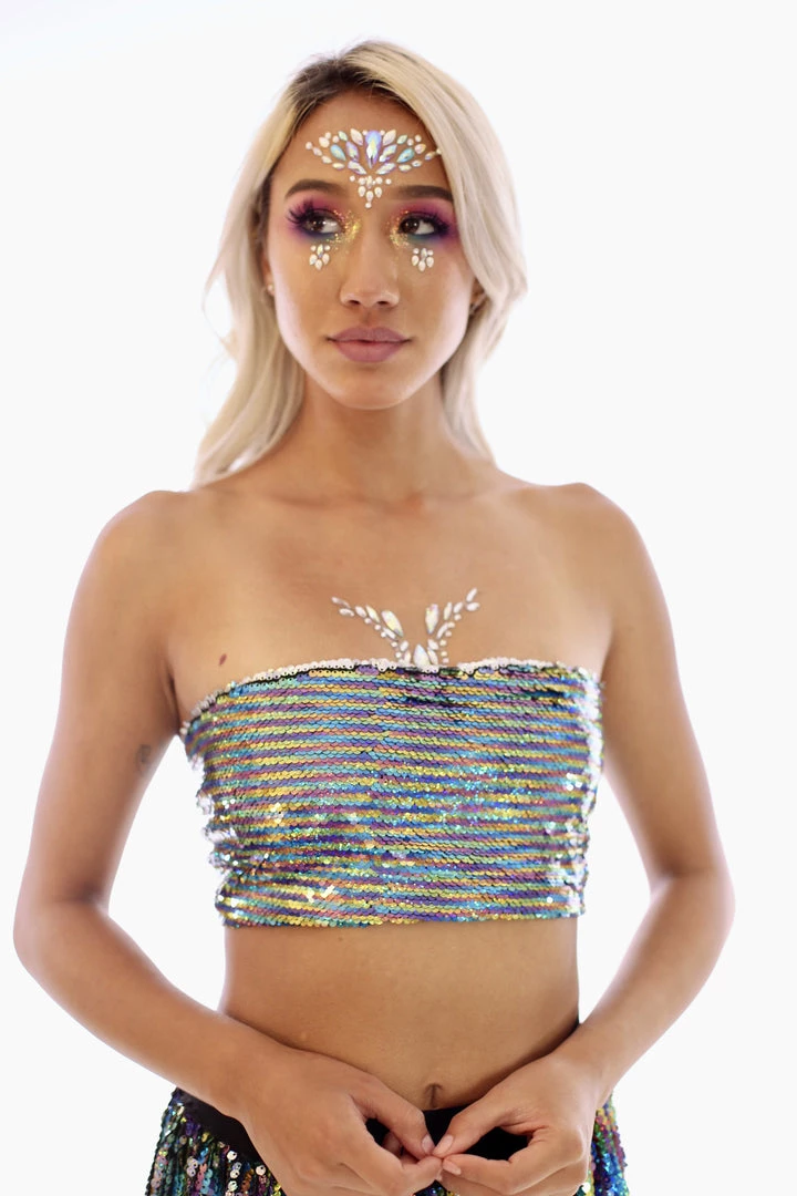 This unique reversible sequin tube top is made of reversible rainbow/holographic sequins. One of our most popular colors! The top is one size, tie at back. Super adjustable & comfortable to wear.