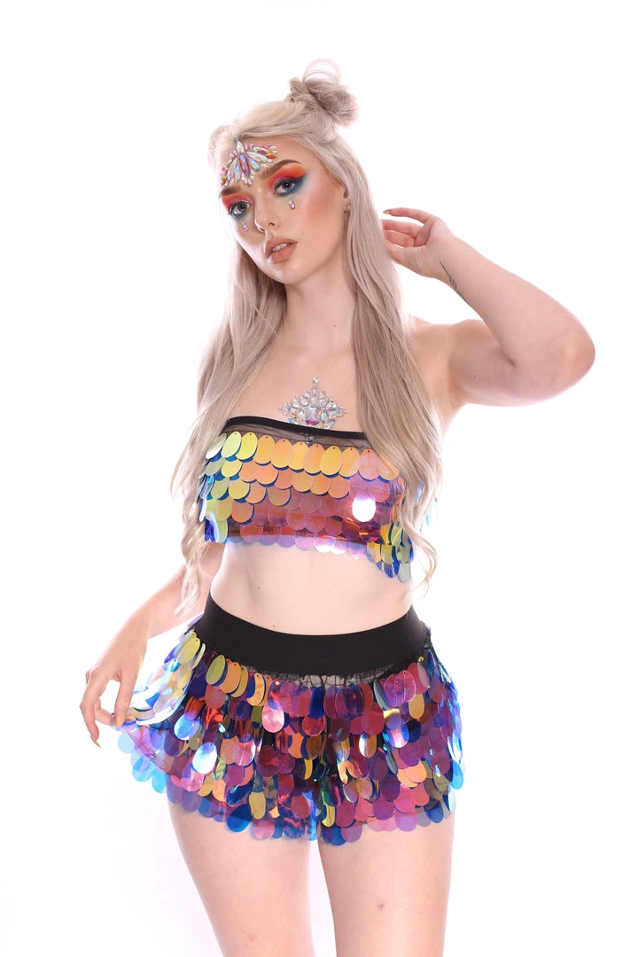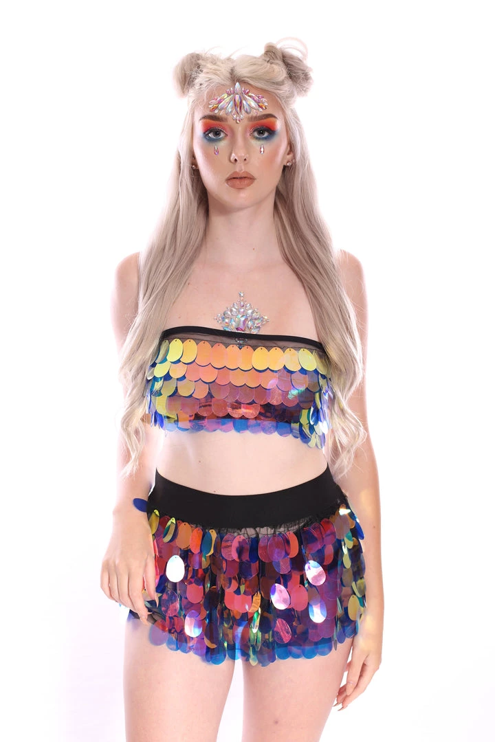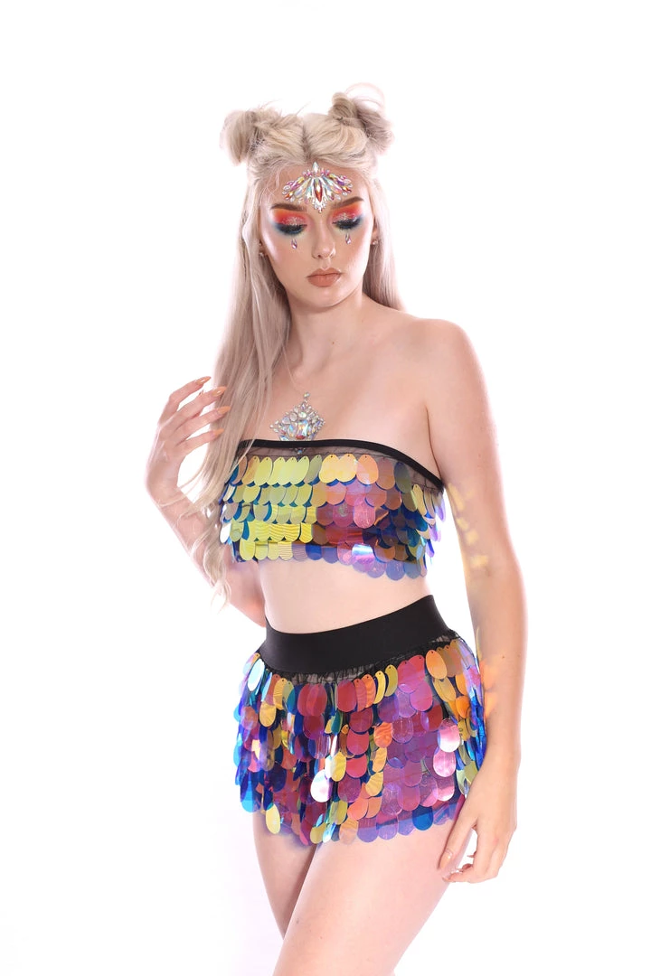 This sequin tube top is made of our signature moon child fabric. You can also wear the back side as front for a even better look. One of our most popular colors! The top is one size, tie at back. Super adjustable & comfortable to wear.