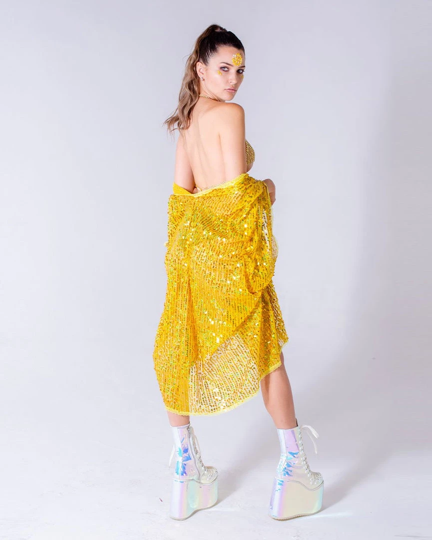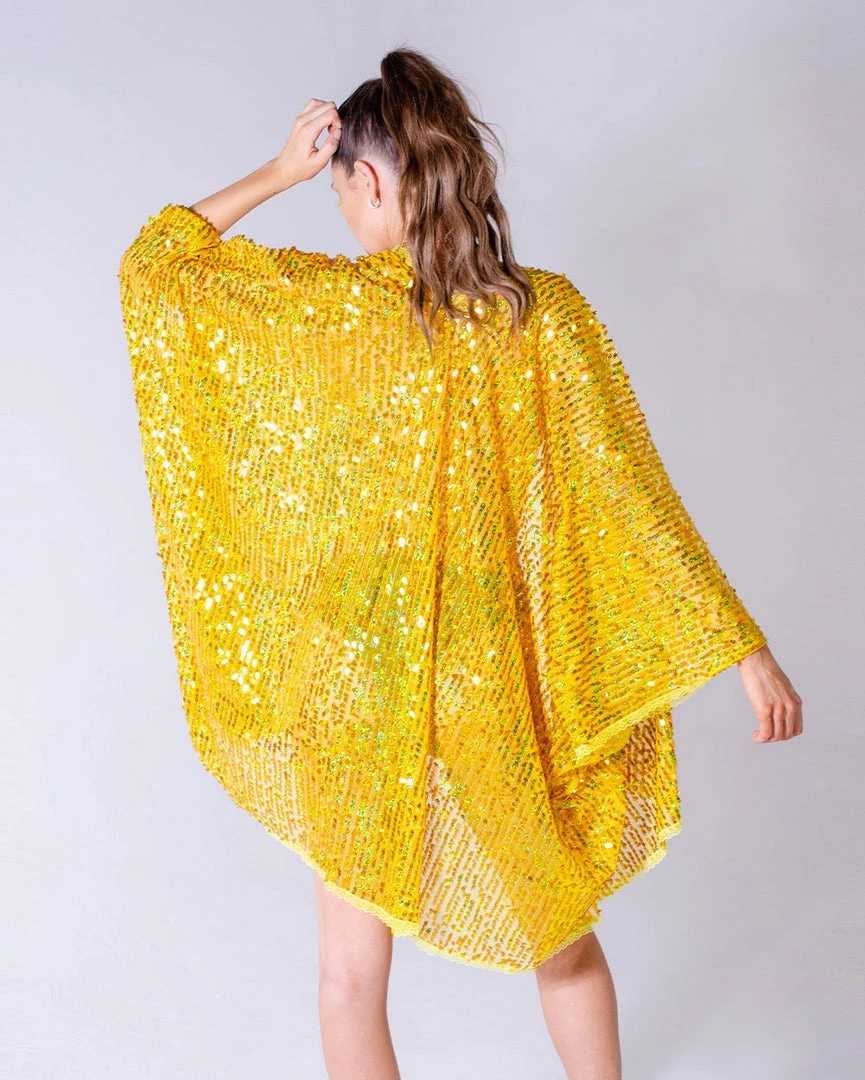 Dance the night away in this bright yellow gold sequin kimono. Each individual sequin reflects the light to shine in every direction. We want you to be the center of attention- that why we ensure the sequins and fabric are of the highest premium material. Exclusively designed and handmade in the USA.Â