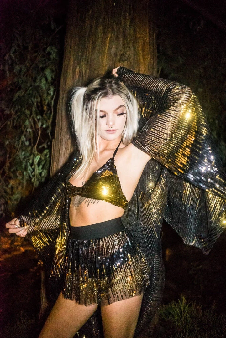 Our unique & beautiful black & gold sequin kimono is exclusively designed and handmade in the USA. We use only the highest quality fabrics and sequins, spreading positive vibes through your movement.This amazing unisex kimono features massive sparkle & shine with sequins that reflect black & gold colors. In the sunlight, the sequins can be seen for miles, during the night, it diffracts light from every direction, no matter how far away.