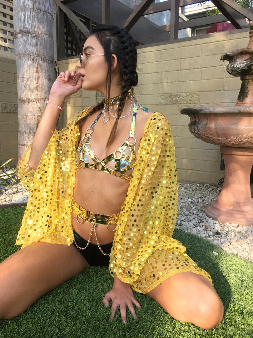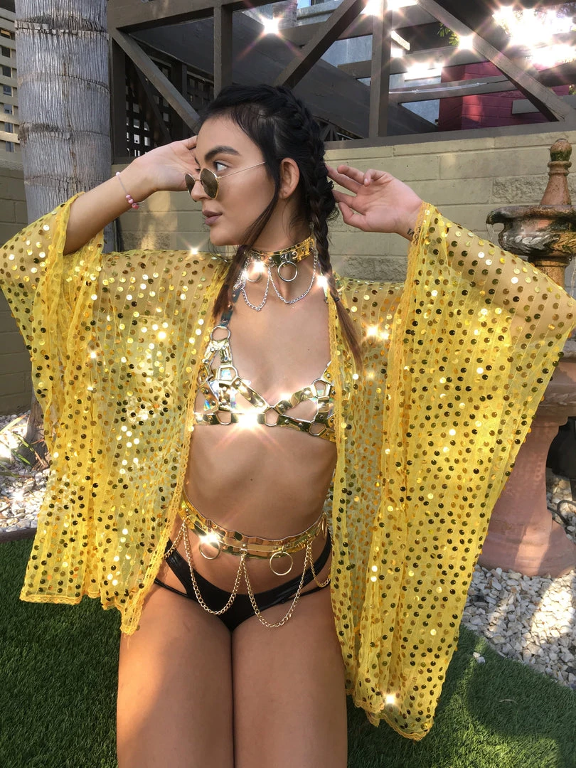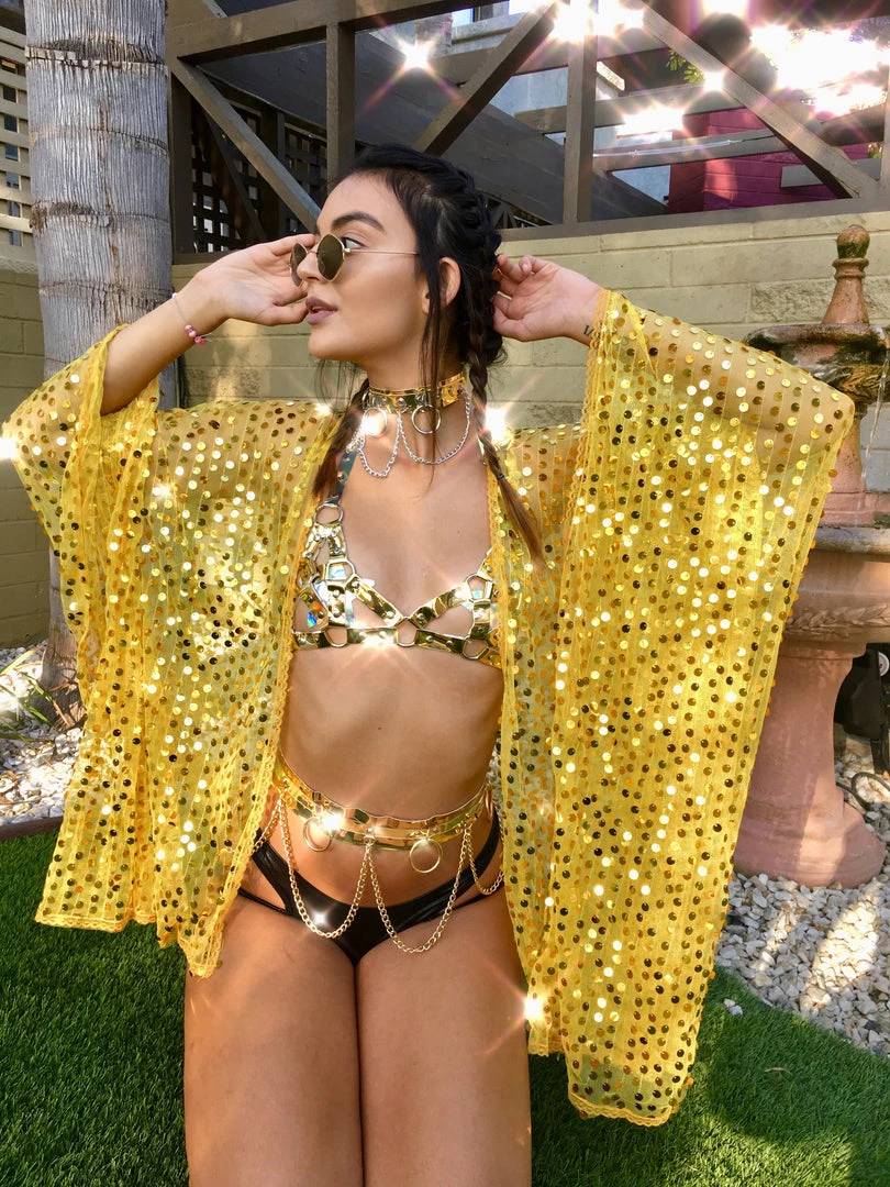 Dance the night away in this honey gold colored sequin kimono. Each individual sequin reflects the light to shine in every direction. We want you to be the center of attention- that why we ensure the sequins and fabric are of the highest premium material. Exclusively designed and handmade in the USA.