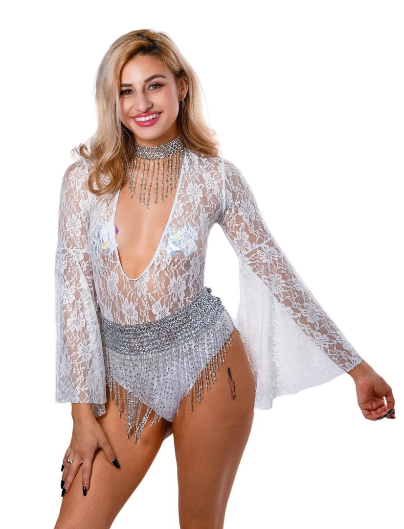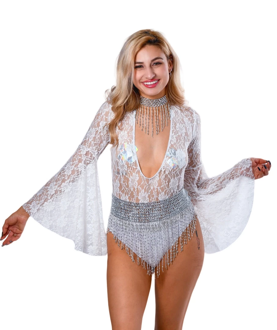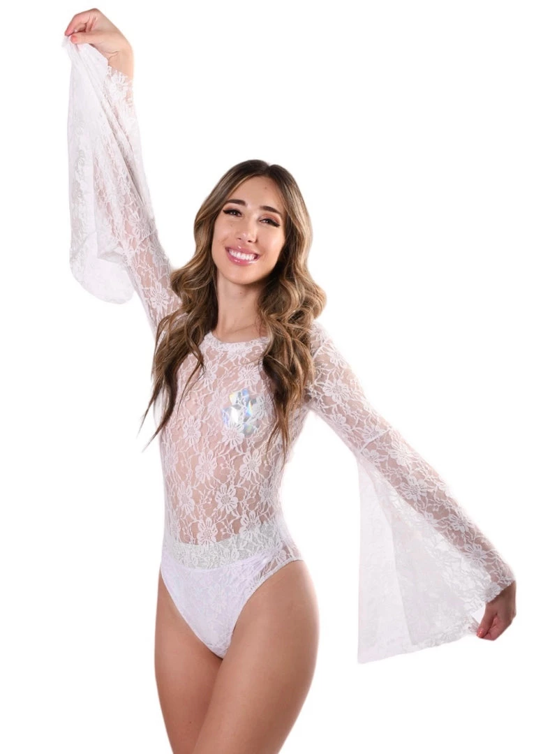 This flowy bodysuit is made of a elegant white lace and has exaggerated bell sleeves for optimal dance movement. Can be worn 2 ways- in the front or to the back as shown in pictures.