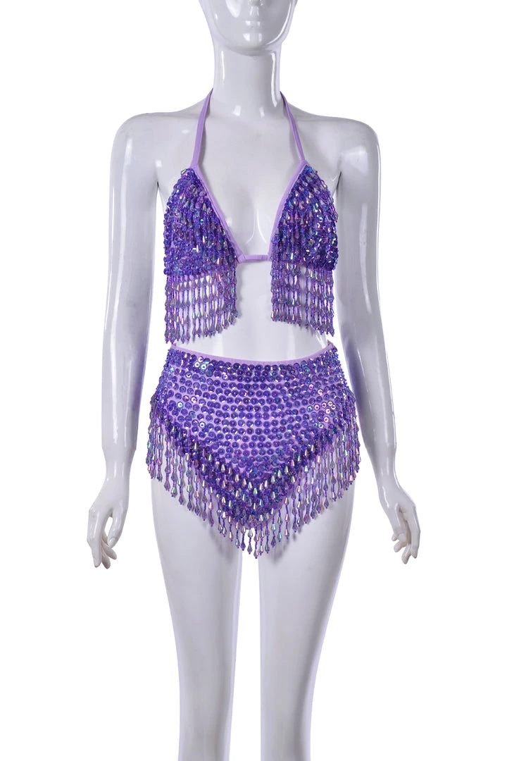 Our lilac hand stitched set sparkles under the light and is made of the highest quality sequins and premium fabrics. Paired with matching purple gloves for an all over fabulous look.Â