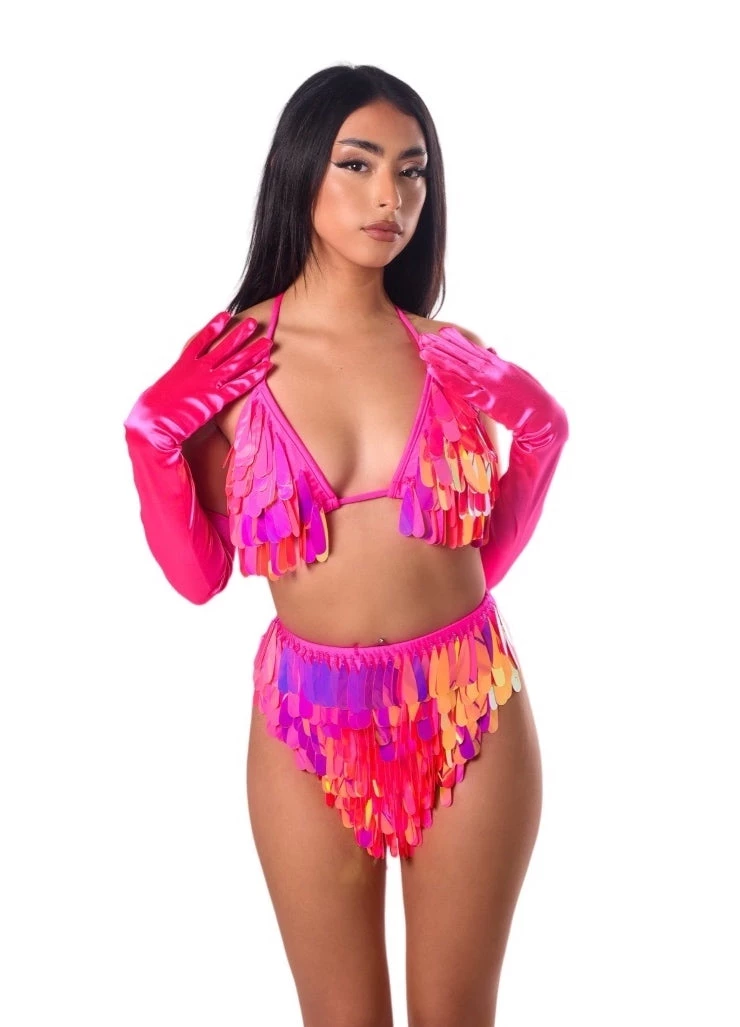 Dance the night away in this iridescent pink set. This set reflects light to create a hue of bright colors that sparkle in the sunlight. Perfect disco, festival, rave attire.