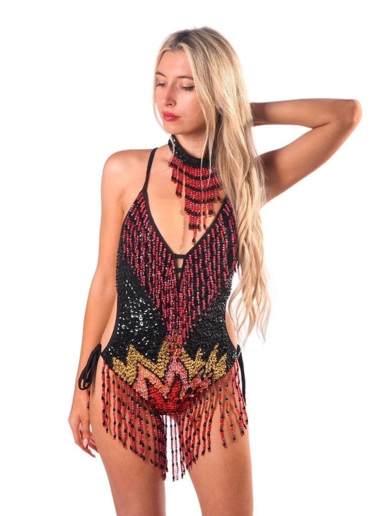 Embrace your fiery side in this all new flaming hot sequin bodysuit. Perfect for festivals, or styling up at any colorful event. Our Hand-Stitched sequin collection uses the most premium materials in the industry. Designed exclusively by us here in Socal. Each sequin is hand-stitched one by one to make sure you sparkle throughout the night.