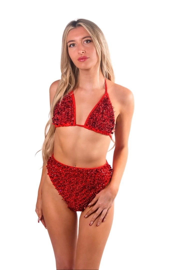 Stand out in this bright ruby red colored sequin set. This set includes a triangle tie top with high waisted cheeky bottoms. Perfect for festivals, or styling up at any colorful event. Our Hand-Stitched sequin collection uses the most premium materials in the industry. Designed exclusively by us here in Socal. Each sequin is hand-stitched one by one to make sure you sparkle throughout the night.