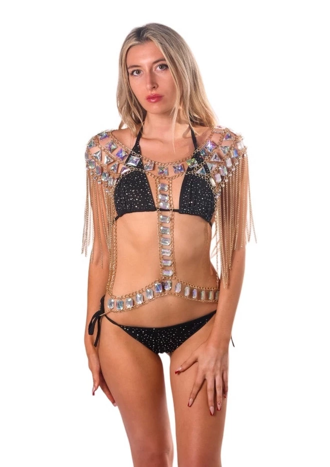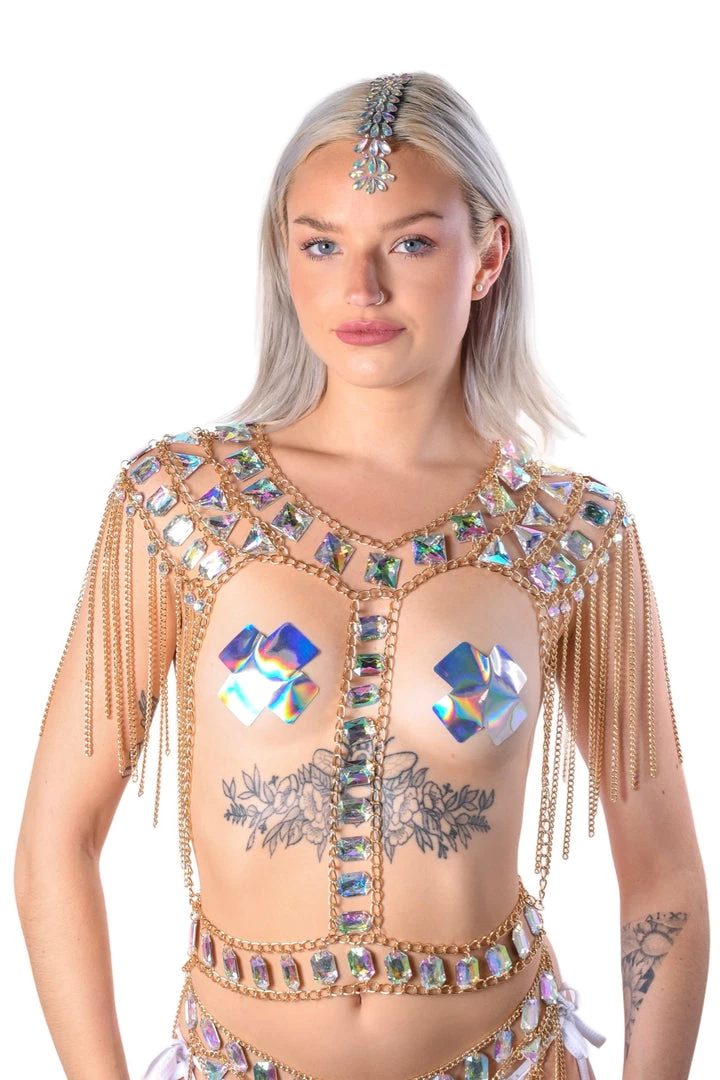 This dreamy iridescent gem over-the-shoulder piece is made of handmade rainbow jewel pieces & gold chains that sparkle in the sunlight.