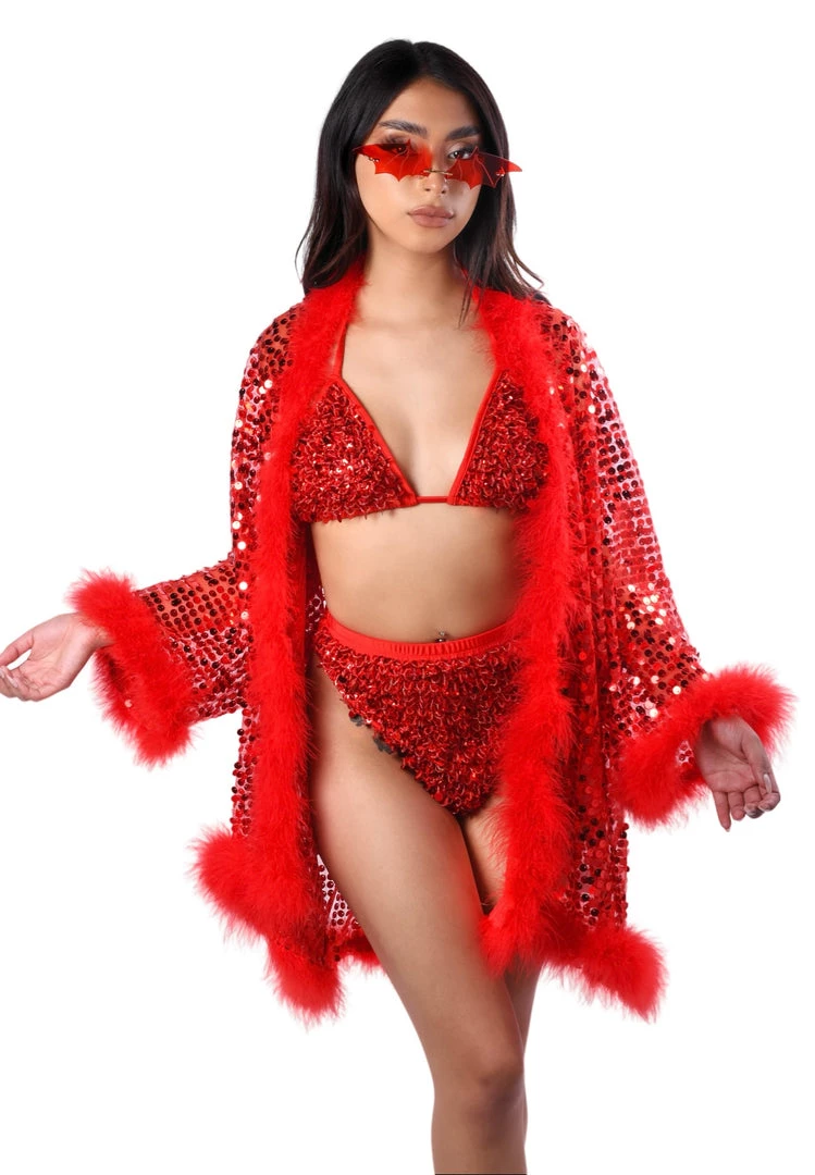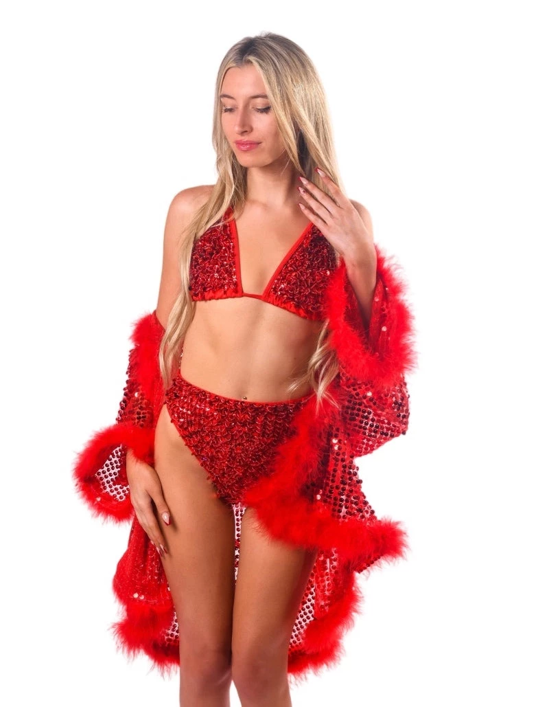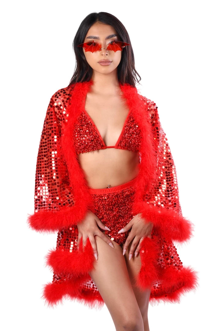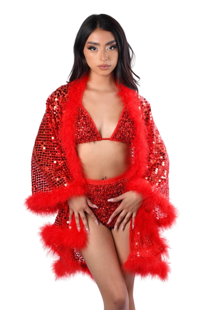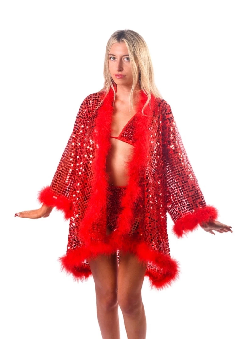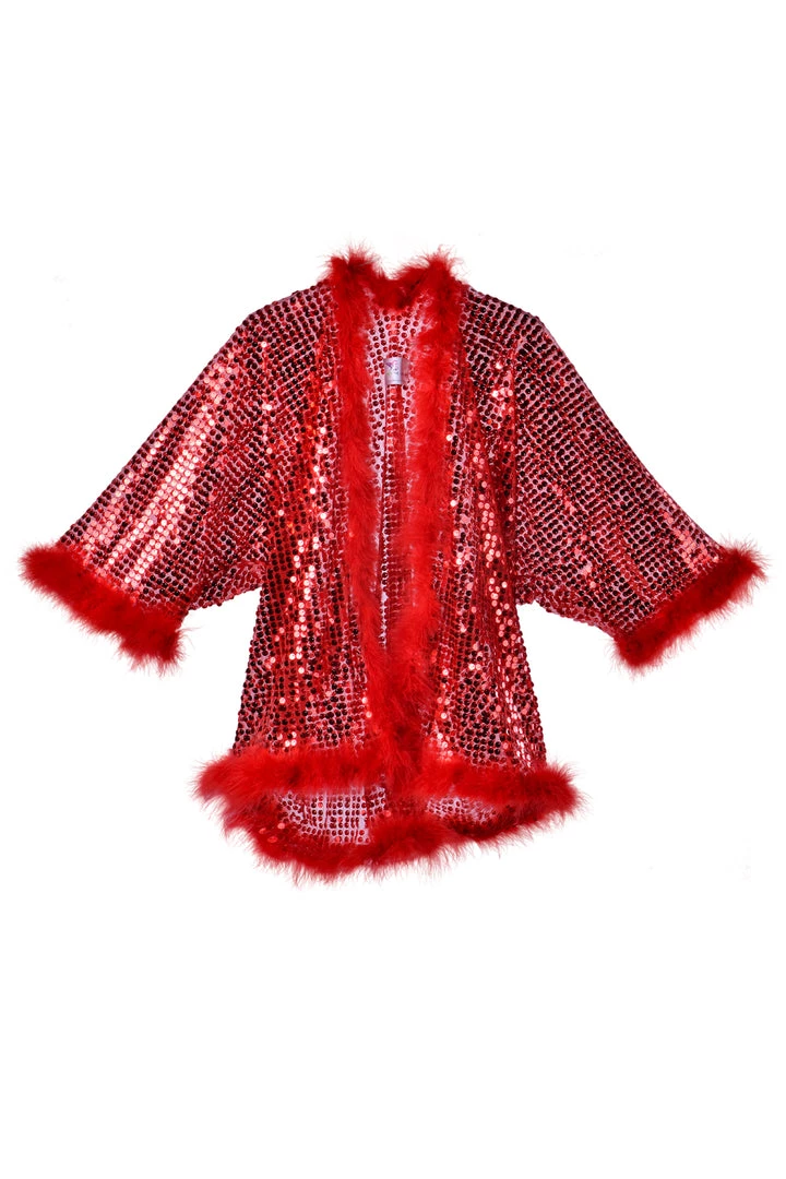 Dance the night away in this bright red sequin fuzzy kimono. This kimono is made of high quality sequin fabric and premium fuzz lining.