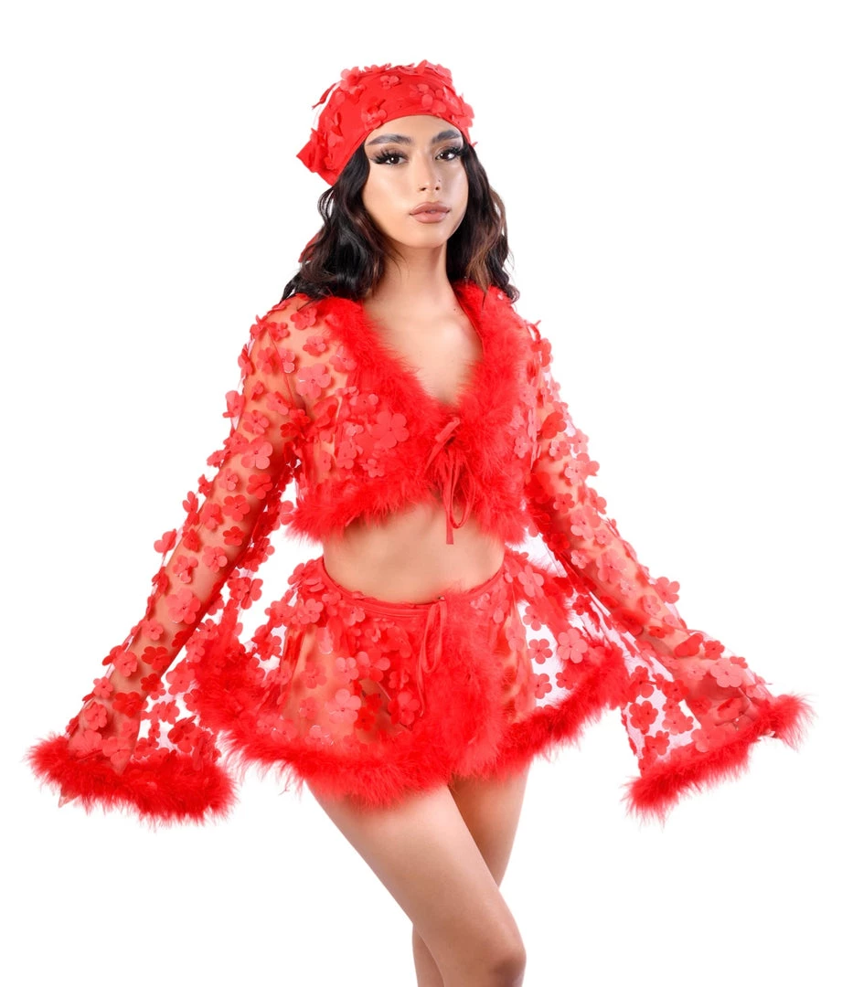 Our favorite style of the season now available in new styles/ colors- Stand out in this bright cherry red set. Made of high quality mesh fabric with 3d flower petal details and fuzzy lining.