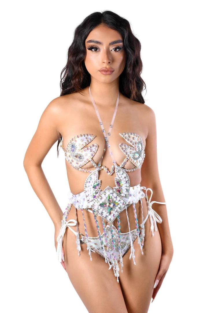 Wander through the desert in this embroidered statement outfit. Made of high quality material and iridescent gem rhinestone pieces. This outfit features a carnival top with matching bottoms and a cross body belt.