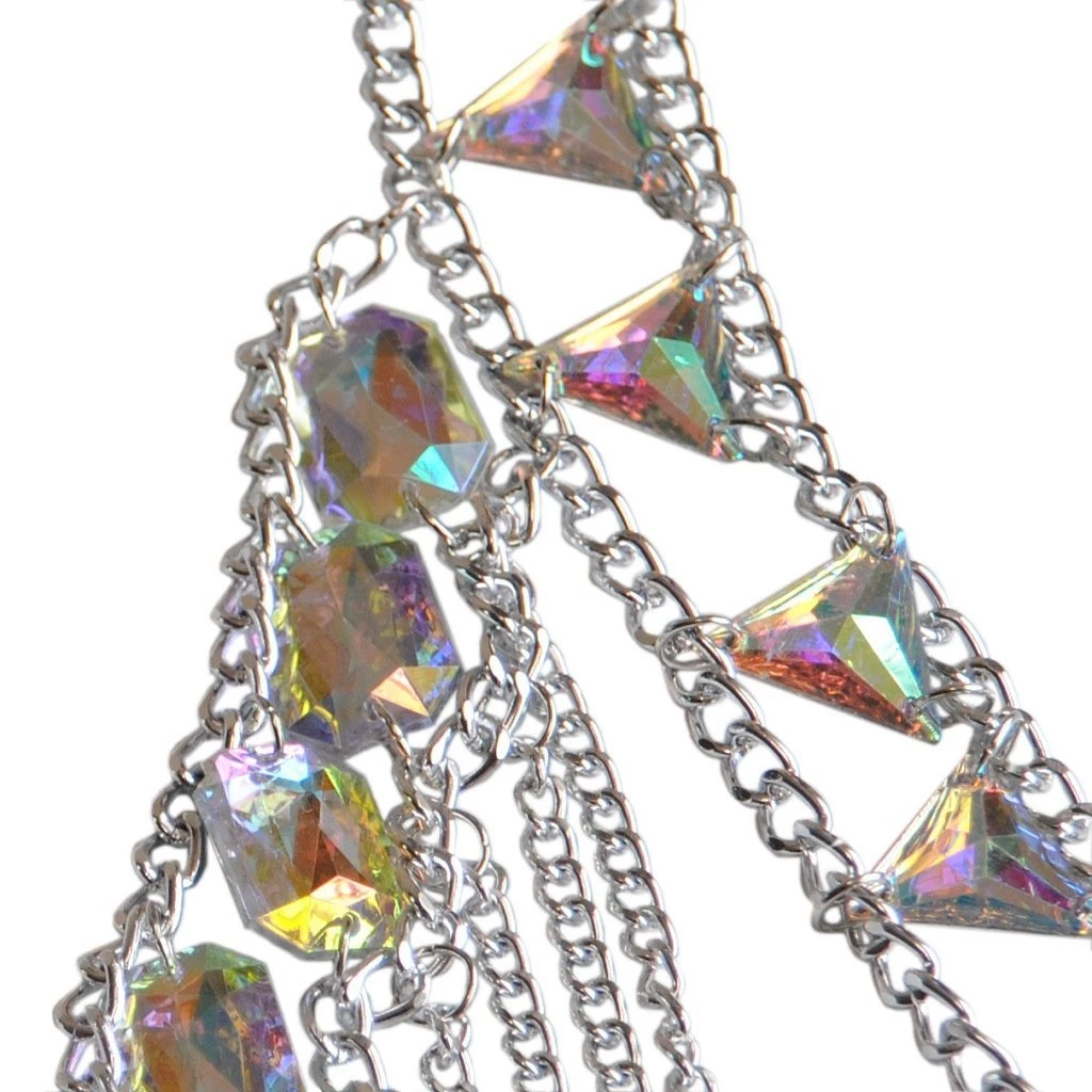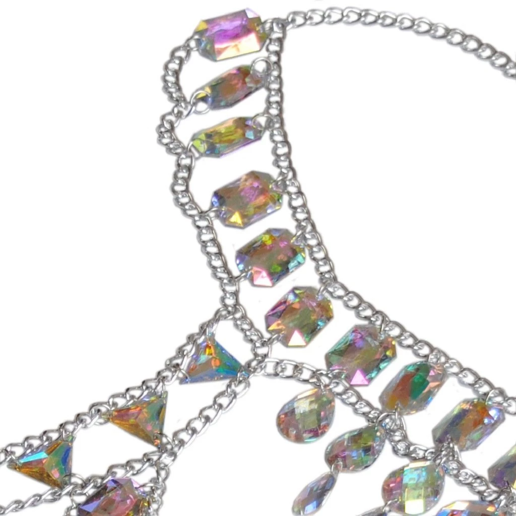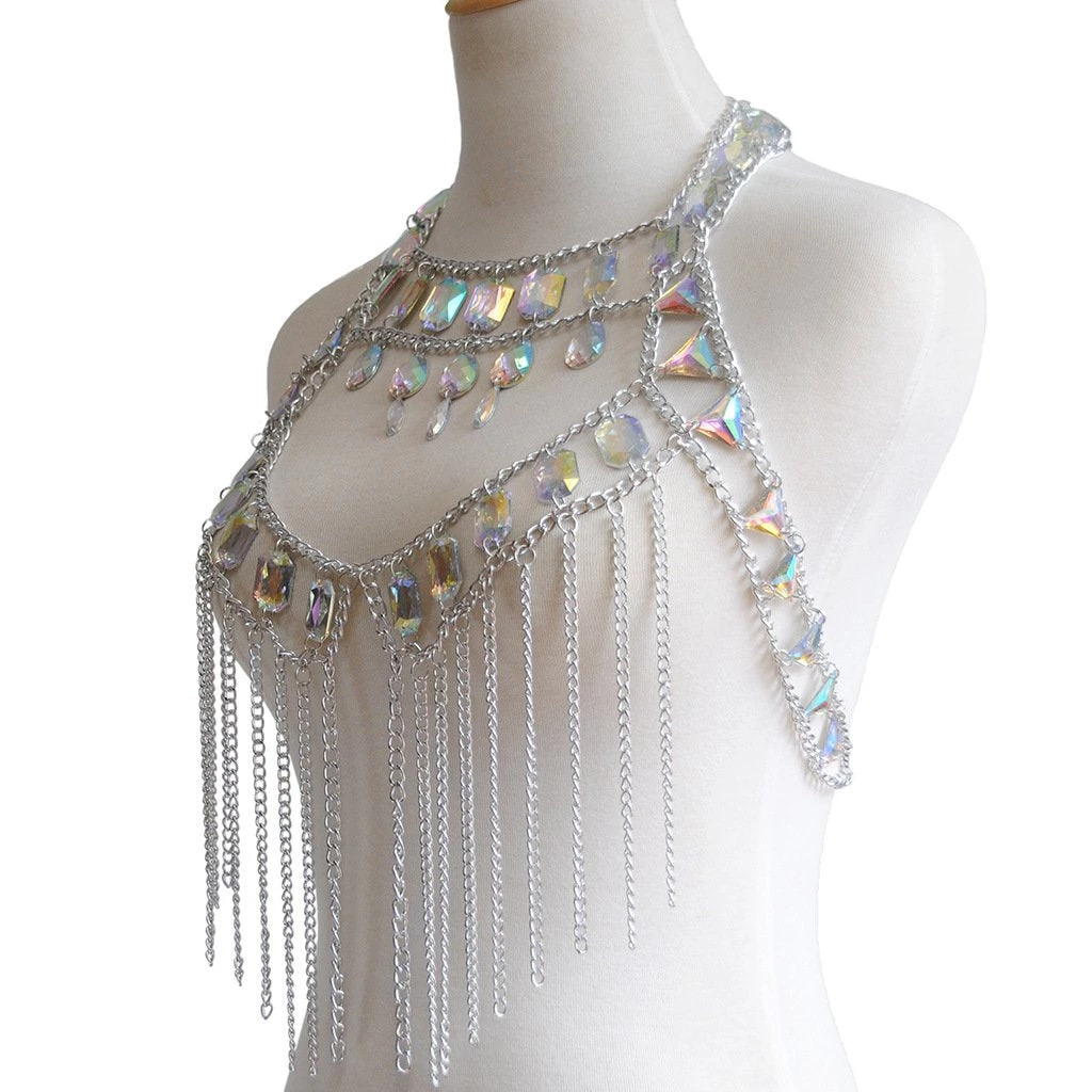 This iridescent dreamy dazzle unicorn gem set is made of handmade rainbow iridescent gem pieces & silver chains, pair with a silver holographic pasties, a black high waist bottom and our sequin kimono for a complete look and be prepare to get lots of compliments at festivals. Easy to wear.