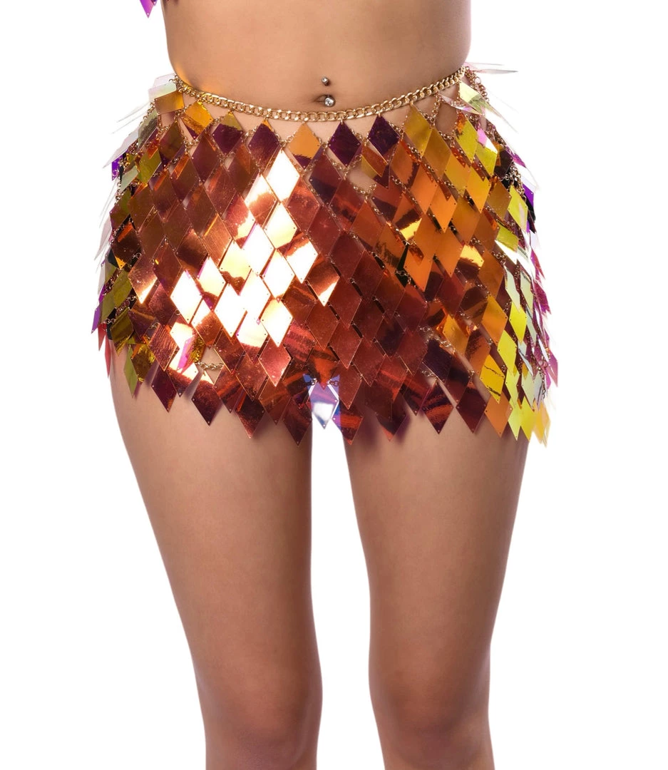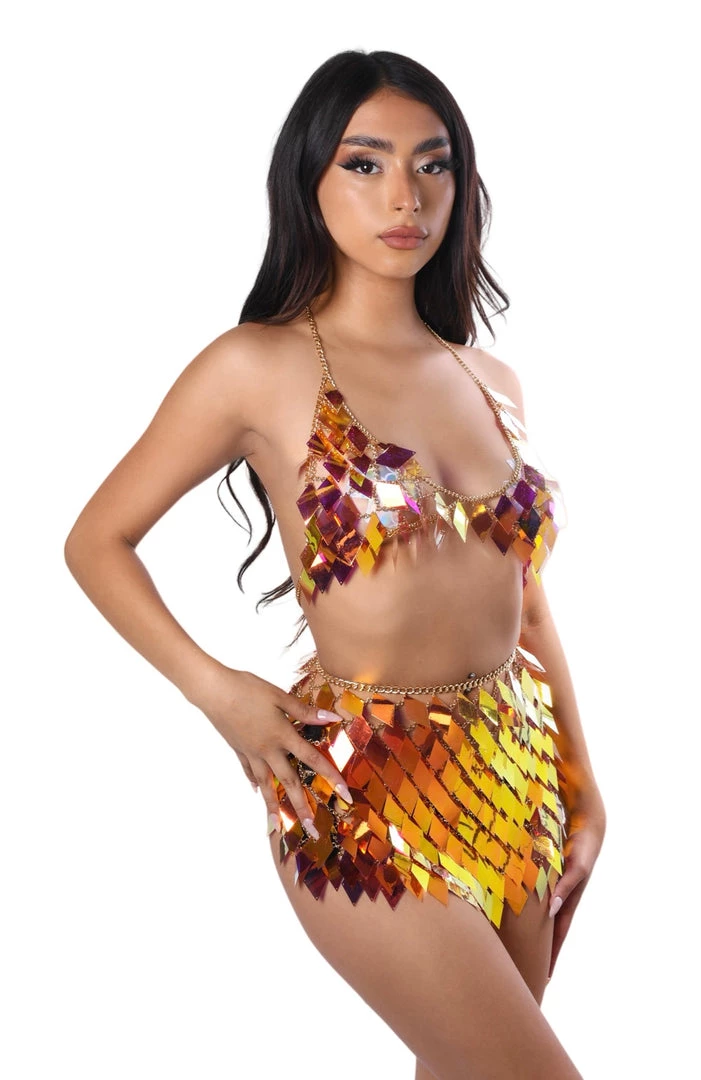 This unique set is made of super shiny drop pieces. This sunset color changing color is one of the most popular trend this year. You can pair the top with different bottom or you can pair the skirt with different top, be creative and wear some same color tone face jewels. It doesn’t take much efforts to look like a queen!