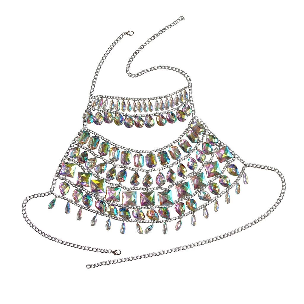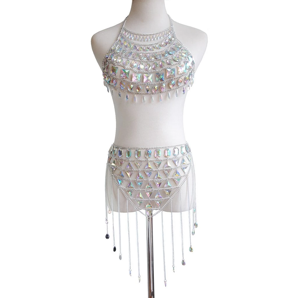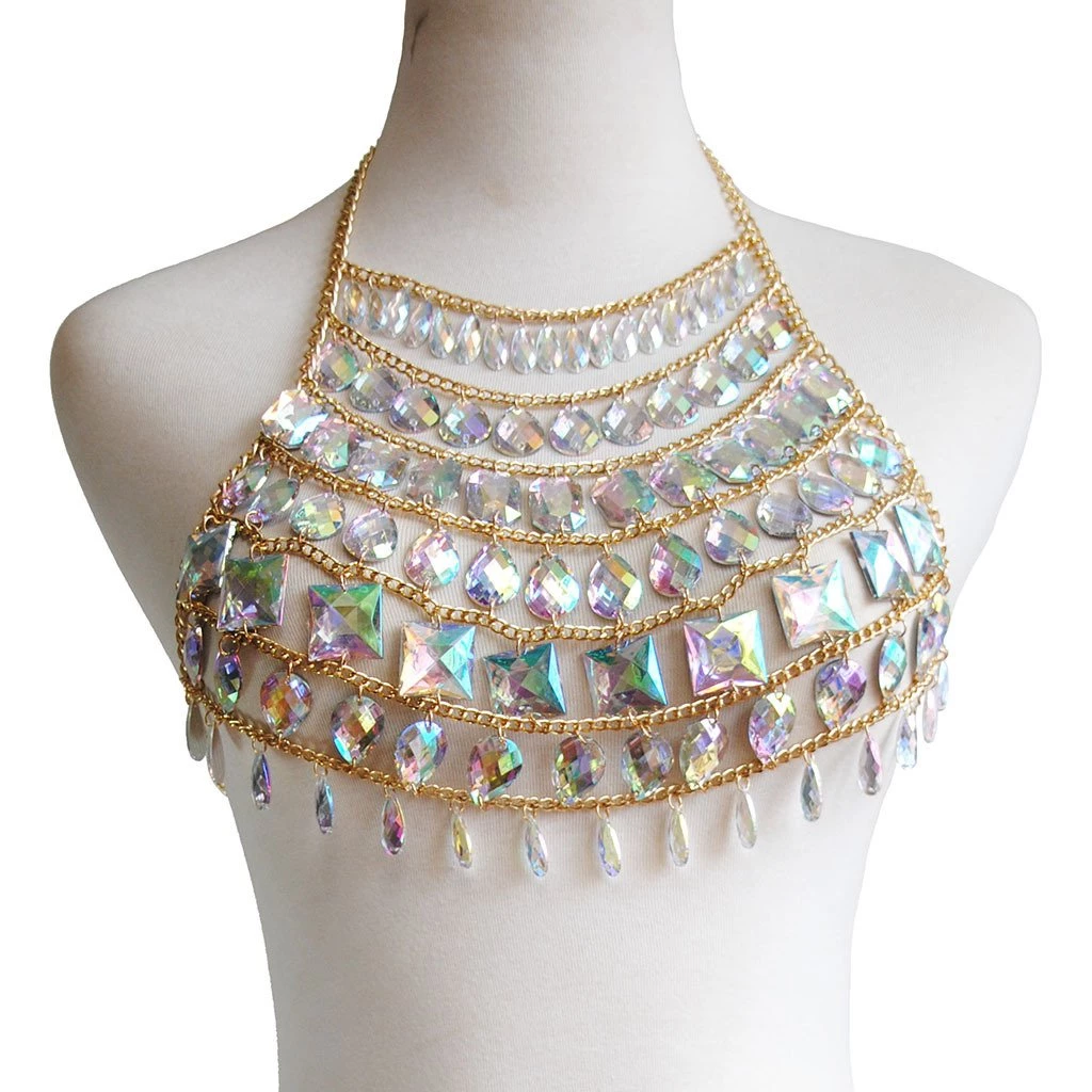 This iridescent dreamy dazzle unicorn gem set is made of handmade rainbow iridescent gem pieces & silver chains, pair with a silver holographic pasties, a black high waist bottom and our sequin kimono for a complete look and be prepare to get lots of compliments at festivals. Easy to wear.