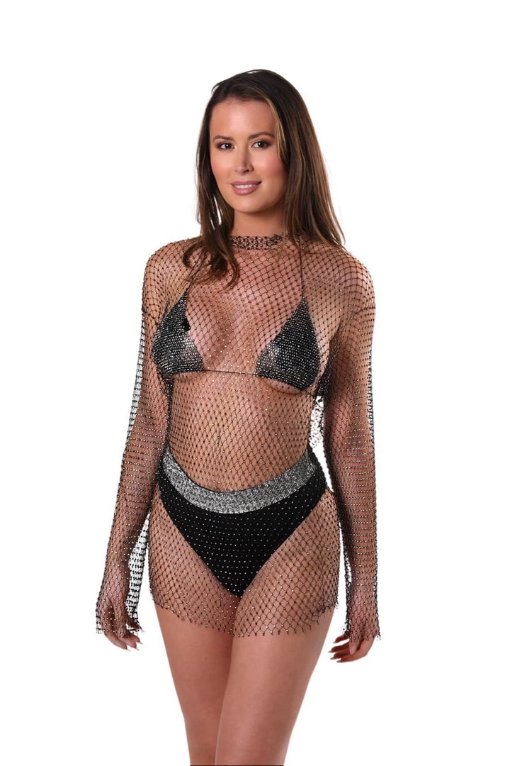 This fishnet lace long sleeve dress is made of rhinestones for an all over sparkle body overlay- perfect worn on its own or as an accent piece over any outfit